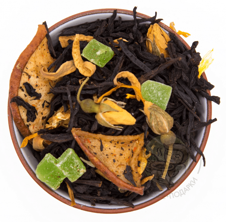 Чай черный цейлонский, кусочки ананаса, сушеные дольки груши, бутоны розы, цветы апельсина, лепестки календулы, лепестки сафлора, аромат фруктового десерта